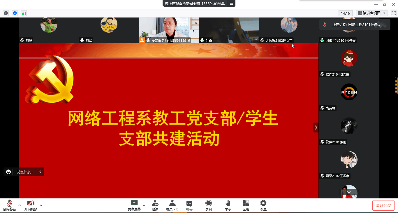 为了增进软件学院师生之间的互动交流,12月18日晚上七时网络工程系教工党支部通过腾讯会议开展了“你问我答师生畅聊”的支部共建活动,网络工程系教工党支部的全体党员、学生党支部副书记刘军老师和软件学院的学生党员及积极分子七十多人参加了会议。