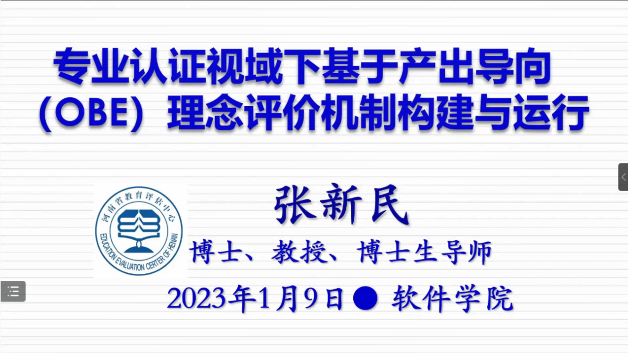 1月9日下午,软件学院邀请机械学院张新民院长做《专业认证视域下基于产出导向(OBE)理念评价机制构建与运行》主题报告,软件学院领导和全体教职工参加了线上报告会,报告会由院长贾宗璞主持。