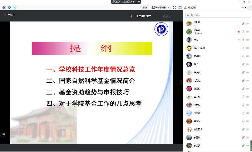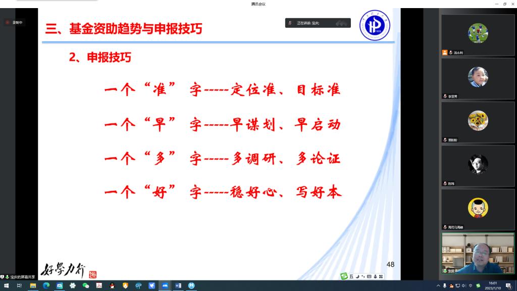 为做好2023年度国家自然科学基金项目的申报工作,2023年1月10日,我院邀请科技处副处长张宝庆为我院教师成功开展2023年度国家自然科学基金项目申报线上培训会。我院全体教师参会。会议由学院副院长汤永利主持。