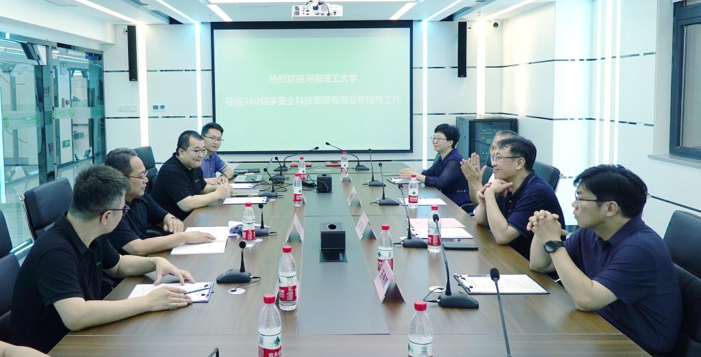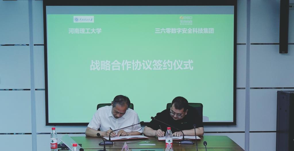 6月18日,河南理工大学与三六零数字安全科技集团战略合作签约仪式在郑州三六零数字城市安全大脑基地举行。三六零数字安全科技集团副总裁李铁牛、河南分区总经理张海彪、河南分区销售经理孟庆明、河南分区技术总监袁留俊,河南理工大学副校长沈记全、软件学院党委书记王伟超、软件学院院长贾宗璞、软件学院副院长赵珊出席仪式。