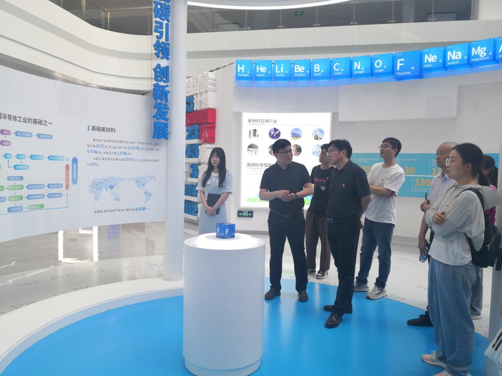 随后,大家又走进多氟多新材料股份有限公司,在多氟多集团智能信息部部长刘海庆、副部长张龙列的陪同下参观了氟基新材料产业研究院。工作人员向大家展示了多氟多集团的氟基新材料、电子信息材料、新能源材料和新能源电池四大业务发展情况,同时重点介绍了“5+1”朵云体系和5G工业互联网平台,智能设计、智能制造、智能采购、智能物流、智能市场一体化平台建设情况。了解了以数据驱动业务、数字孪生与产业融合开展的创新,感受了高质量党建引领高效率科研创新成果转化和企业的飞速发展。