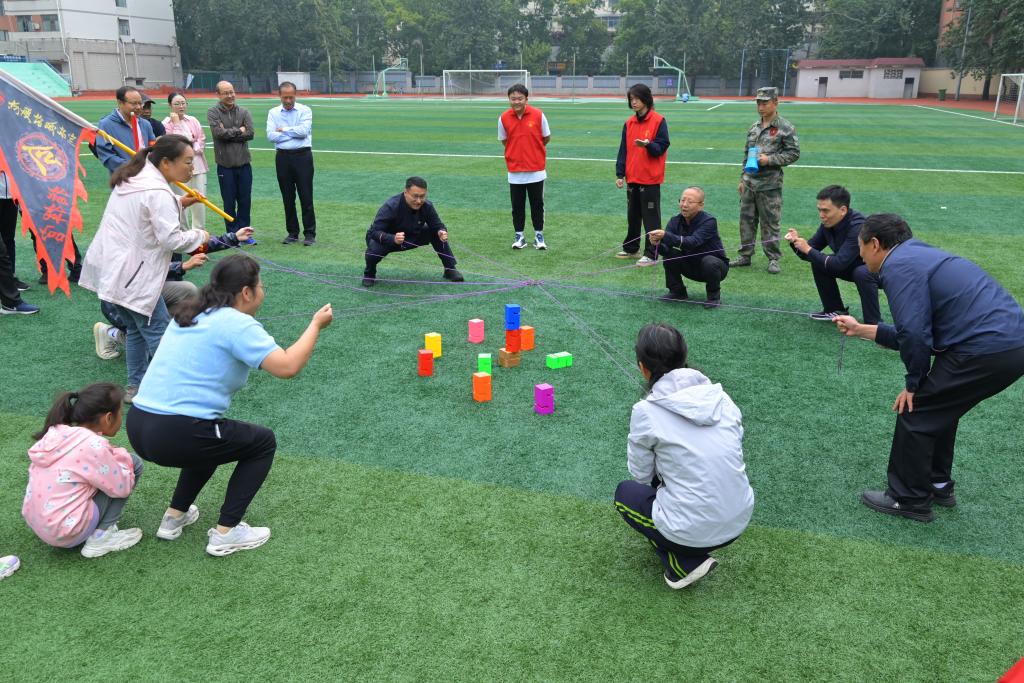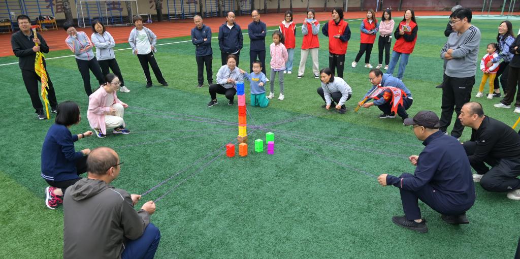 随后,在焦作市“龙威”素质拓展专业指导教师的带领下,教职工分为四队,完成了“团队展示”、“九层经纬”、“无间道”、“四国争霸”四个项目的训练。教练先按照性格色彩划分了红色、黄色、绿色、蓝色四个区域,通过报数组建起搭配合理的团队。在“团队展示”活动,各队喊出响亮的口号,摆出团队造型,通过该项目使大家打下彼此信任、团结协作的基础。在“九层经纬”活动中,团队所有人拉着绳索,控制积木的摆放,考验的是团队成员齐心协力、自强自信的默契配合度,大家在队长的指挥下,小心翼翼控制着每一个动作,仔细摆放好每个积木。接下来的“无间道”活动,每名队员手握pvc管,紧密连接,从起点开始,把球安全运送到终点的一个杯中;最后的“四国争霸”,团队要控制好网,颠球数最多的队伍获胜。活动在紧张有序、欢声笑语中落下帷幕。
