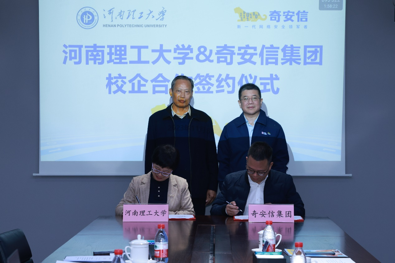 11月8日,河南理工大学与奇安信集团战略合作签约仪式在北京奇安信安全中心举行。奇安信集团高级副总裁曲晓东、高校合作中心总经理林雪纲、河南分区行业总监齐壮、业务顾问宋传德,河南理工大学软件学院院长贾宗璞、副院长赵珊、副院长汤永利和教科办主任韩秀娟出席仪式。
