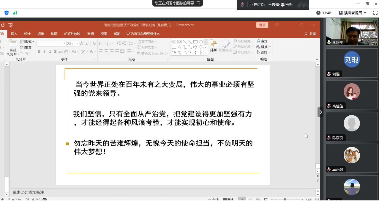 校纪委副书记李照修以《党风党纪及师德师风教育专题》为题作专题报告,他首先讲述了中国共产党在中国近代史中的发展、崛起历程,让大家深刻理解了中国共产党是历史的必然选择。接着从新民主主义革命时期发展至中国特色社会主义新时代的历史维度,阐述了勇于自我革命,全面从严治党是中国共产党区别于其他政党的显著标志。最后围绕“如何破解大党难题”,结合个人的研究、学习体会,就把握新征程全面从严治党的新要求新部署作了分享。