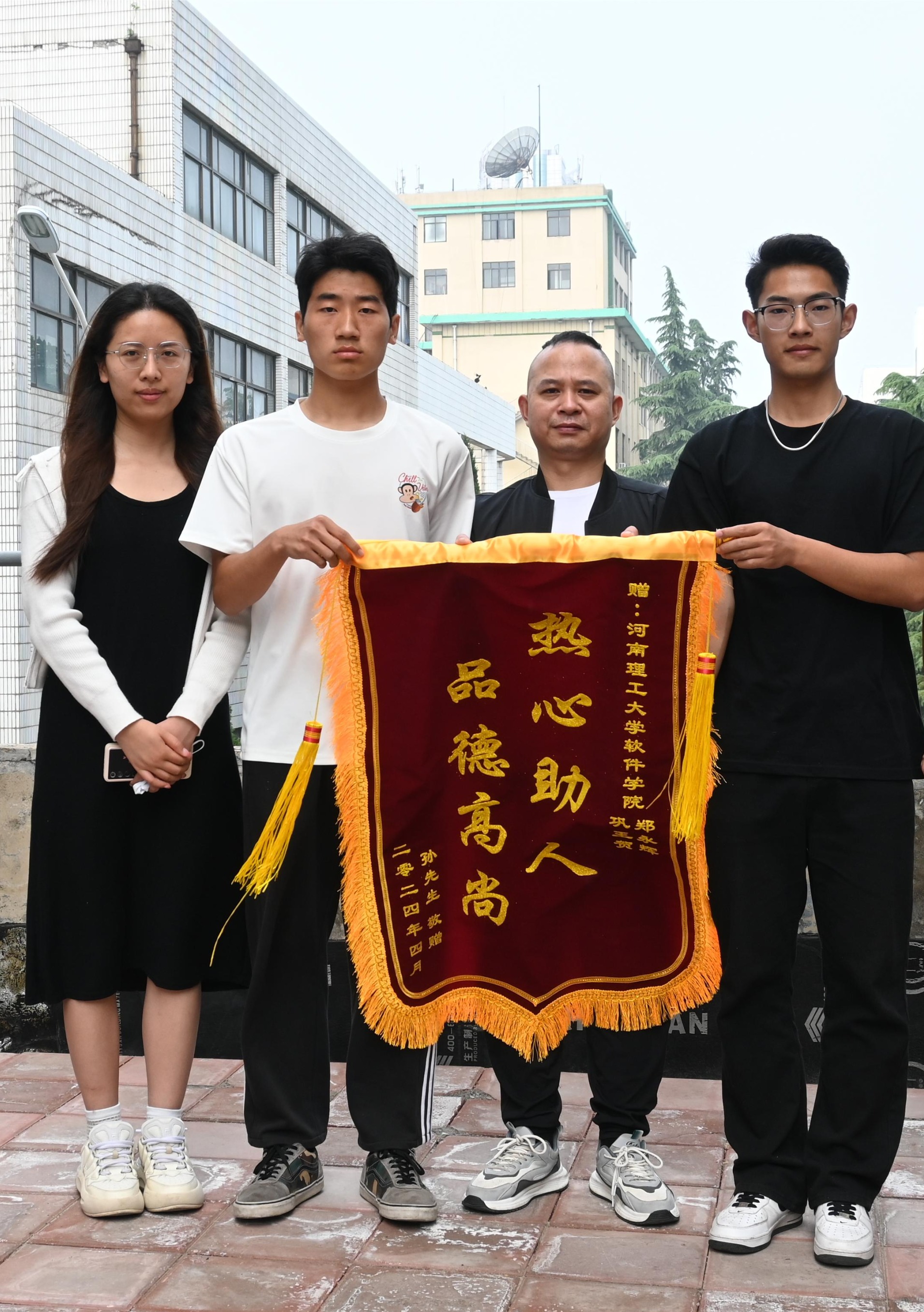 近日,焦作市民孙先生特意赶到北校区软件学院,送来了一面写着“热心助人 品德高尚”的锦旗。软件学院网安23级巩王贺、郑永辉两位同学的热心救人事迹赢得了师生广泛赞誉。