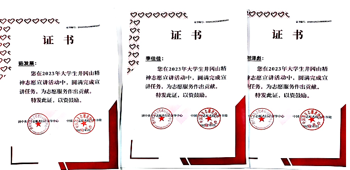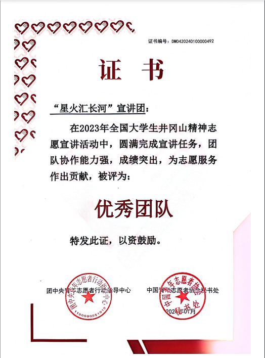软件学院“星火汇长河”井冈山精神宣讲团是由软件学院刘军老师指导,经过半年的宣讲活动,在团中央组织的评选中从2023年全国高校遴选的千支“井冈山精神志愿宣讲团”中脱颖而出,获得团中央“优秀团队”称号,茹发展、李佳佳等同学获得“优秀个人”,由团中央资助、受邀参加2024年“全国大学生井冈山精神志愿宣讲团”优秀团队第一期社会实践活动。