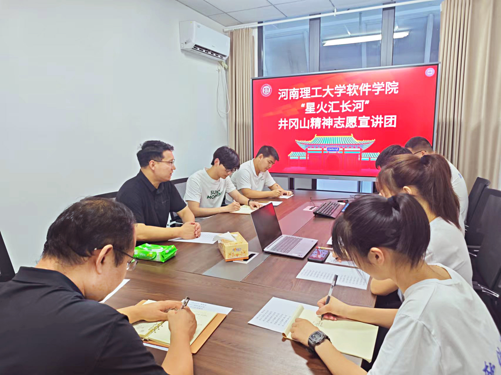 会议还结合井冈山社会实践的优秀经验,讨论了本次社会实践的宣讲内容、宣讲形式,以及工作分工、实践任务等事项。