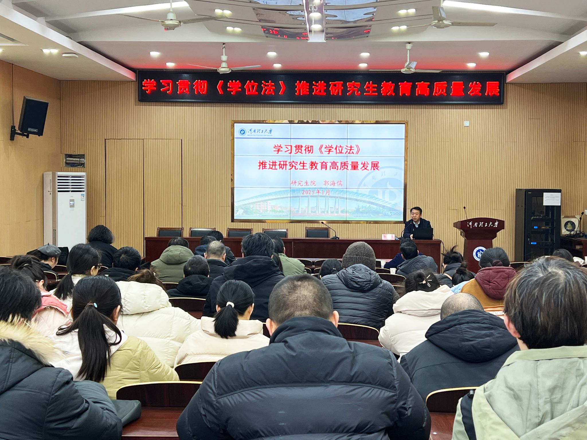 1月14日上午,校宣传部部长茹艳作题为《深入学习贯彻习近平文化思想 开创新时代学院宣传思想文化工作新局面》的报告,她着重强调了全面做好宣传思想文化工作的重要性,并梳理了习近平总书记的相关重要论述,结合学校文件要求,她对学院在政治理论学习、意识形态、课程思政与网络思政等方面提出具体建议。接着,烟台大学刘志中教授作题为《国家自然科学基金项目申请书撰写经验交流》的报告,他首先介绍了国家自然科学基金申请的基本认知,强调其重要性及流程;接着深入讲解申请书撰写技巧;最后总结申请经验及注意事项,助力教师们更好地准备基金申请。下午,研究生院副院长郭海儒作题为《学习贯彻学位法》,推进研究生教育高质量发展》的报告,他全面深入讲解《中华人民共和国学位法》,详述修订历程、立法背景及关键修订点,剖析学位授予、学科建设等核心内容,结合学院学位点建设实际,他提出针对性指导意见,针对面临的问题与挑战,从学位法角度给出解决方案。