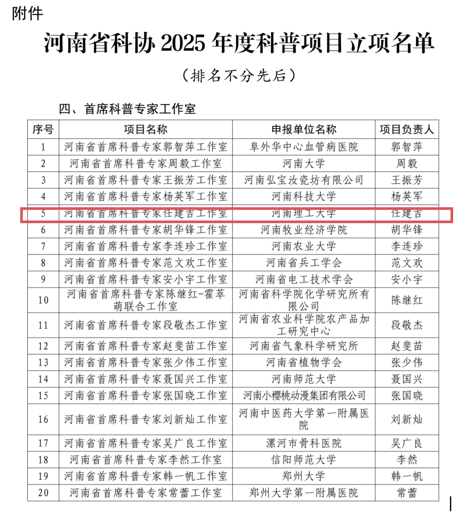 近期,河南省科学技术协会发布《关于公布2025年度科普项目立项名单的通知》,项目范围涵盖政府单位、央国企、医院、科研机构及社会组织等多领域,其中“河南省首席科普专家工作室”共立项20个项目,我校申报的“河南省首席科普专家任建吉工作室”系首次获批立项。