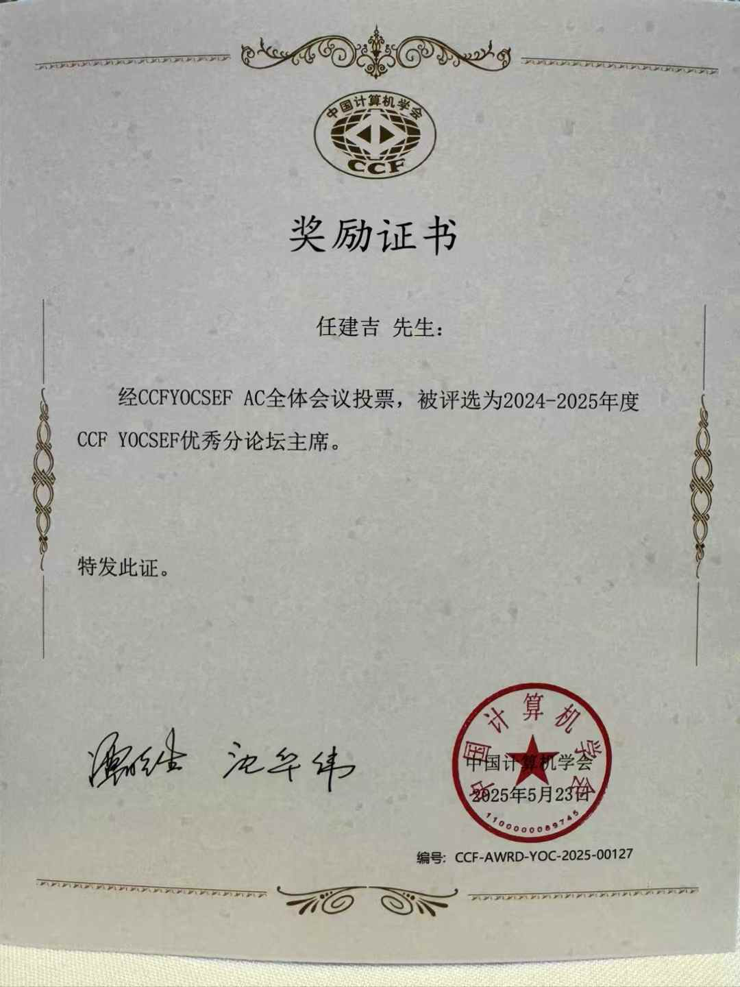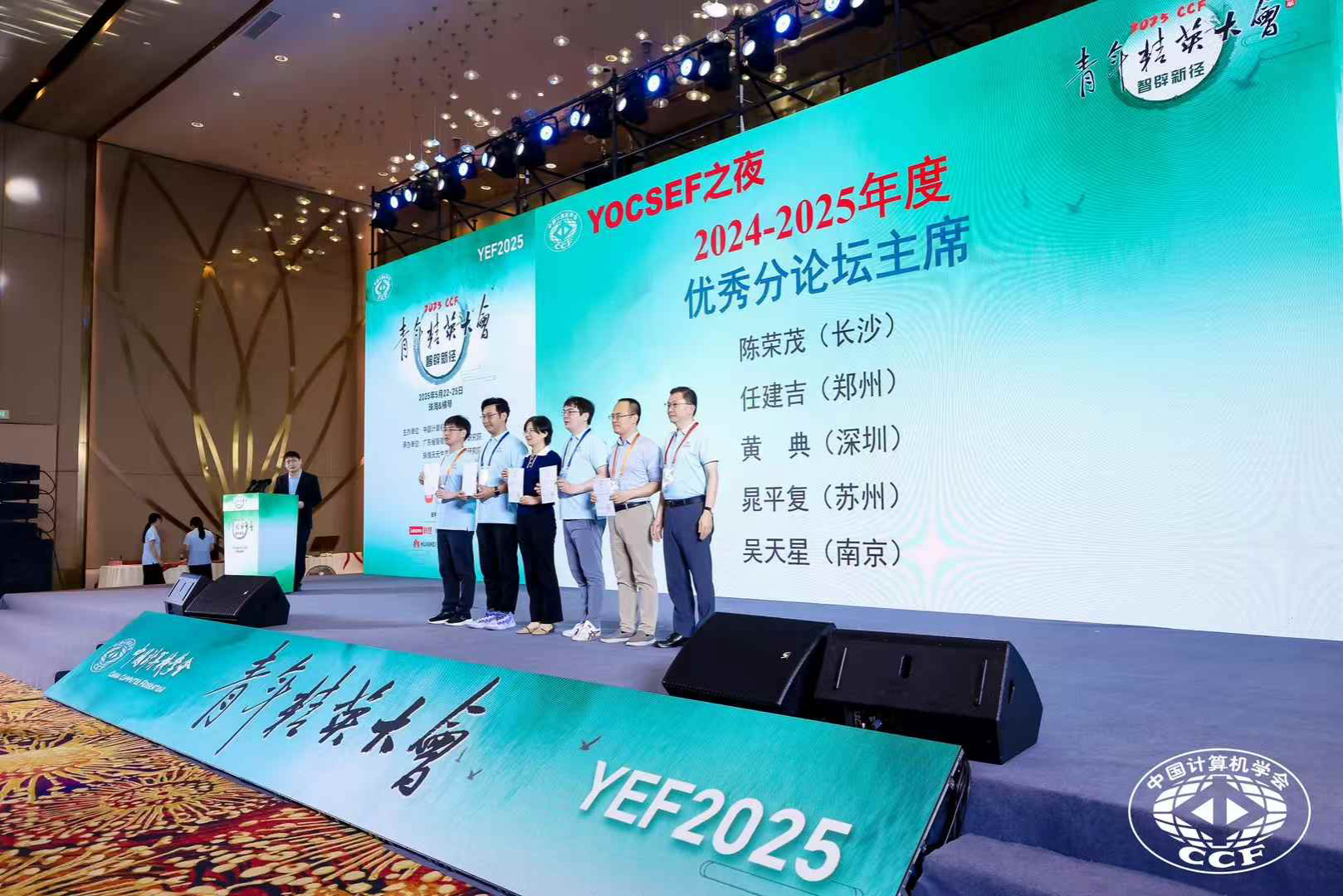 2025年5月24日,在中国计算机学会青年精英大会(YEF 2025)上,我院教师任建吉在担任中国计算机学会青年计算机科技论坛郑州分论坛主席期间,凭借卓越表现,在年度分论坛大比武中荣获“优秀分论坛主席”,该荣誉每年仅颁发5人。