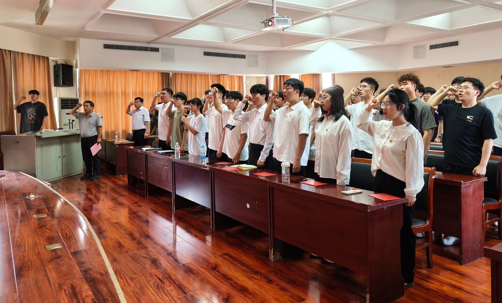 活动在庄严的《国际歌》中拉开帷幕,党委书记王伟超宣读了新发展党员名单后,为每位新党员佩戴党员徽章,赠送新党员纪念卡和纪念册。“入党纪念卡”“入党纪念册”里包含有党的基本知识等内容,时刻提醒每位同学勿忘共产党员的光荣使命。随后由学生党员代表领誓,全体党员举起右拳面向党旗郑重宣誓,铮铮有力的誓言充分体现了全体党员坚定不移听党话跟党走的决心,也时刻提醒着全体党员初心如磐,使命在肩。最后,王伟超带领同学们回顾了近期国内外的重要时事,并借此对全体党员提出希望和要求,一要坚定理想信念,做新时代的信仰者;二要勇于担当作为,做新时代的奋斗者;三要坚持人民至上,做新时代的服务者;四要严守纪律规矩,做新时代的践行者。