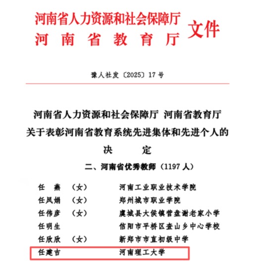 近日,河南省人社厅和教育厅公布《关于表彰河南省教育系统先进集体和先进个人的决定》,我院软件学院教师任建吉榜上有名,荣获“河南省优秀教师”荣誉称号。这一殊荣不仅是对任建吉老师在教育教学、科研创新和社会服务等方面长期耕耘的充分肯定,也是我院教师队伍建设和育人质量提升的重要体现。