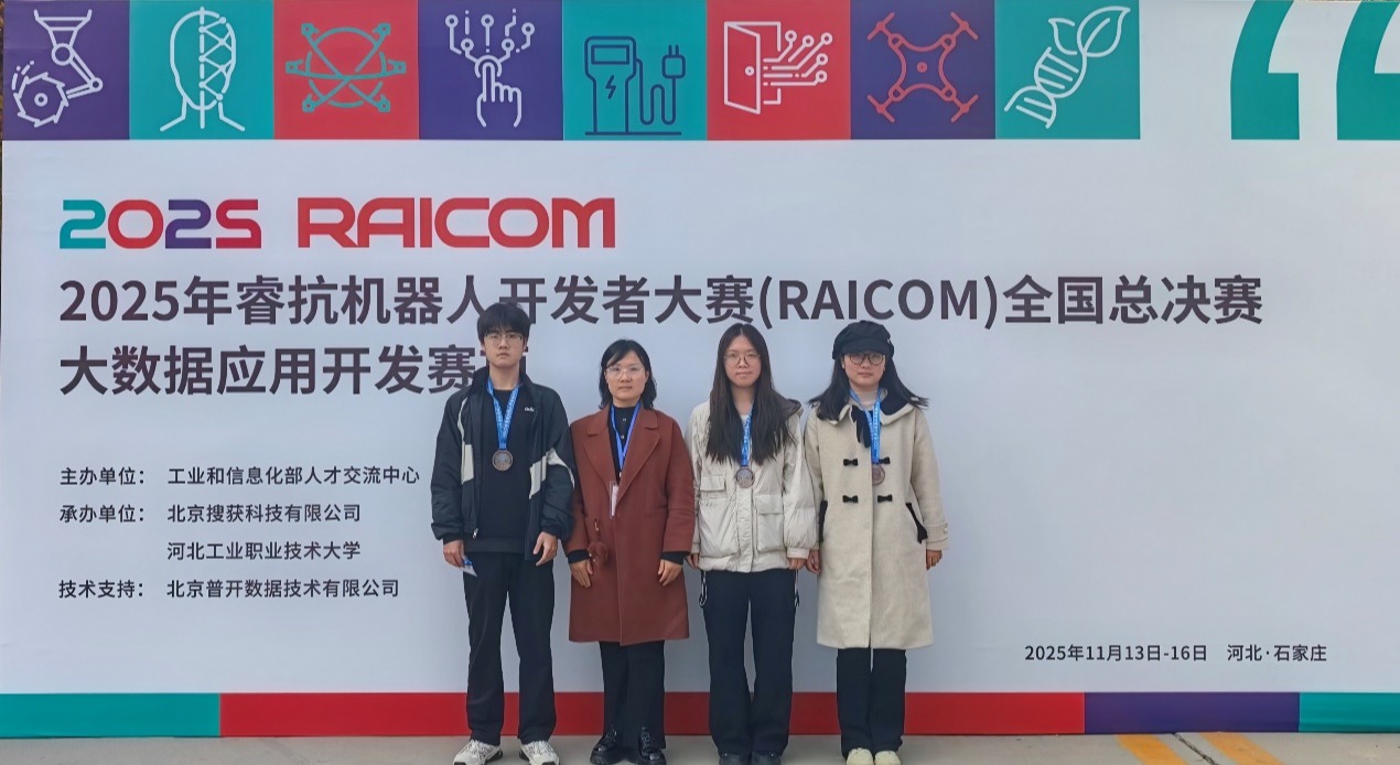 11月16日,2025年睿抗机器人开发者大赛(RAICOM) 大数据应用开发赛项全国总决赛圆满落幕。软件学院学生丁自强、田微、李聪聪凭借扎实的技术功底与创新实践能力,在个人赛中脱颖而出,均荣获全国总决赛三等奖。此次获奖不仅彰显了学院在人工智能与大数据人才培养方面的显著成效,更体现了学子们在国家级竞赛中的强劲竞争力。