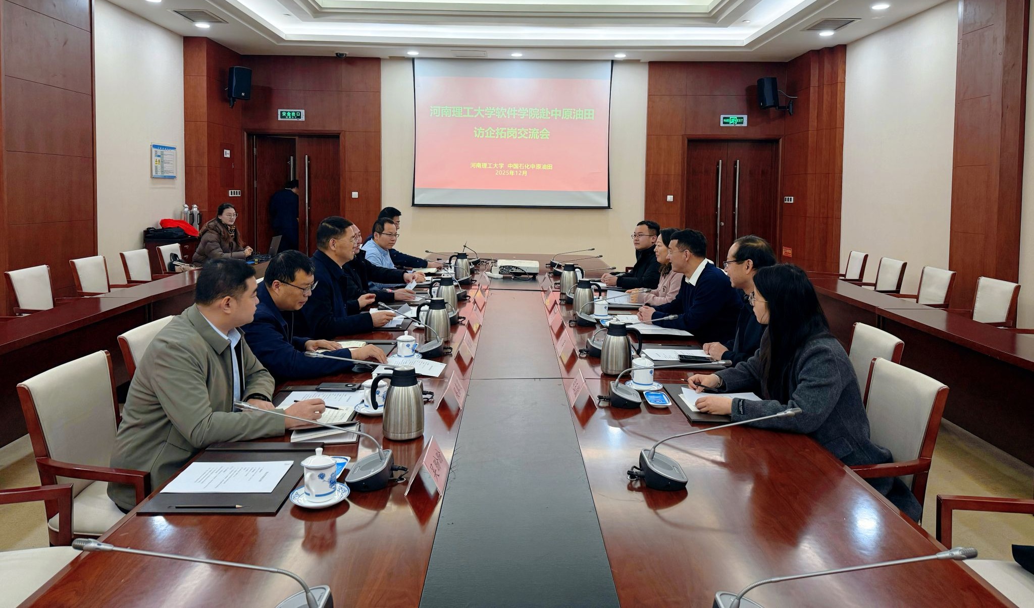 在与中石化中原油田的座谈会上,张艳明详细介绍了学院的发展历程、学科特色、专业优势以及人才培养情况,表达了学院积极对接企业需求、推动产学研融合的意愿。中原油田党委组织部副部长、人力资源部副经理张灿表示,目前已有36名我校校友在油田关键岗位任职,这充分体现了学校人才培养与行业需求的高度契合。中原油田信息化管理中心党委书记、副经理郭海伟系统介绍了中原油田在“人工智能+”行动中取得的阶段性成果,涵盖办公提效、勘探开发、经营管理等多个场景,并表示期待与我院在博士人才培养、科研协同等方面开展深度合作。最后,中原油田副总政工师、党委组织部部长、人力资源部经理陈东升再次对学院一行表示热烈欢迎,并希望双方在既有的战略合作协议基础上,进一步在人才培养、实习基地建设等方面拓展合作领域、深化合作内涵。