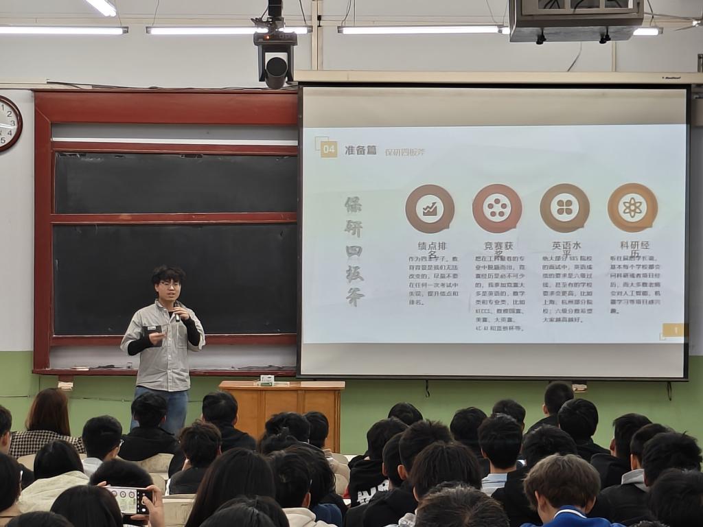 活动邀请了软件21级4班孔绅宇同学作分享报告,网络空间安全专业2023级全体同学参加。孔绅宇主要从专业学习、考研、保研、竞赛四个方面进行了分享。他强调在专业学习上,要端正学习态度,注重课堂效率,做好课前预习和课后复习,理论与实践相结合,以赛促学。保研需要从绩点排名、竞赛获奖、英语水平、科研经历四个方面做努力。考研需要前三年打好基础课和专业课基础。最后给大家分享了适合网络空间安全相关专业参加的竞赛和竞赛经验技巧。与会同学认真学习,收获很多,会后和孔绅宇进行了热烈的讨论和交流。