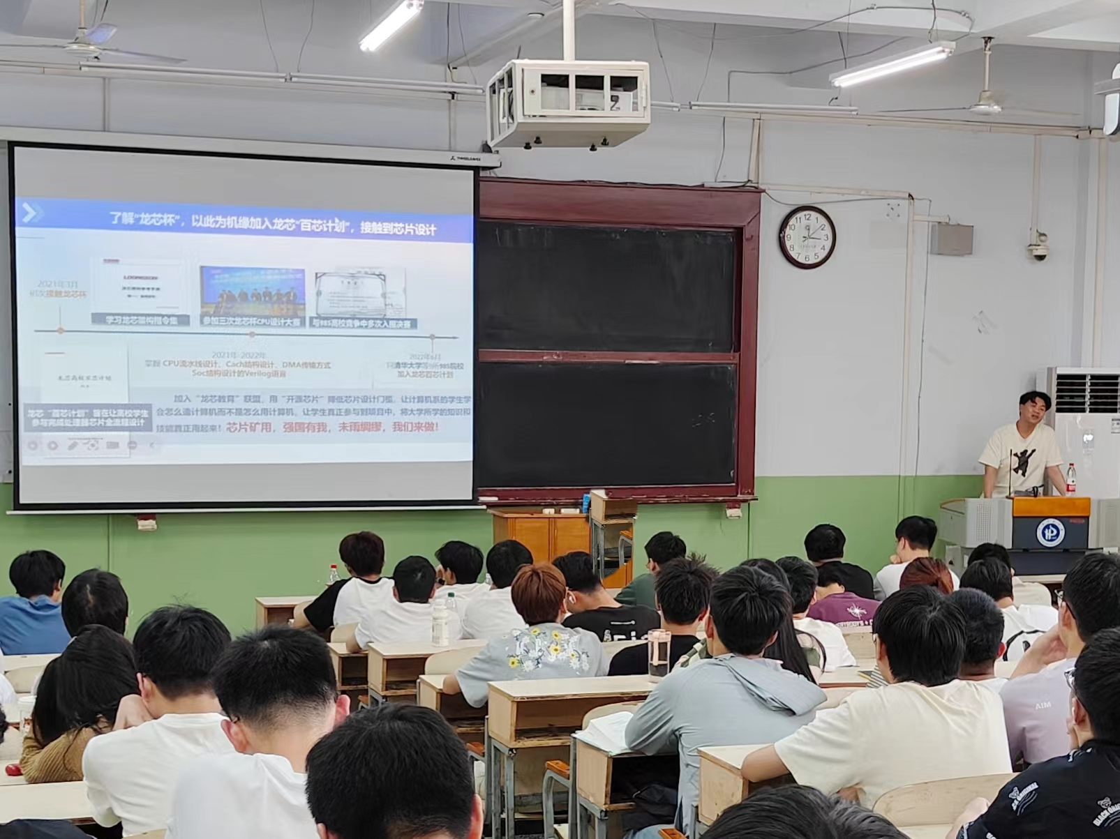 首先,获得"互联网+"大学生创新创业大赛国家级铜奖的包子旭从个人简历、学习经历、成长收获和“互联网+”比赛四个方面全面而深入地进行了分享交流,并结合实例讲解介绍了龙芯CPU构建的系统实现操作的原理,通过深入浅出的方式,使同学们了解到了技术领域的最新动态和发展趋势。接着,获得中国大学生实践与创新能力全国总决赛铜奖、ISCC全国总决赛二等奖的赵天佑不仅聚焦于“互联网+”领域的比赛,更广泛地探讨了其他比赛领域的见解和经验。他指出,每个比赛领域都有其独特的挑战和机遇,并进一步强调了迈出第一步的重要性。他鼓励同学们勇于尝试不同领域,发掘自身潜力,实现自我价值。