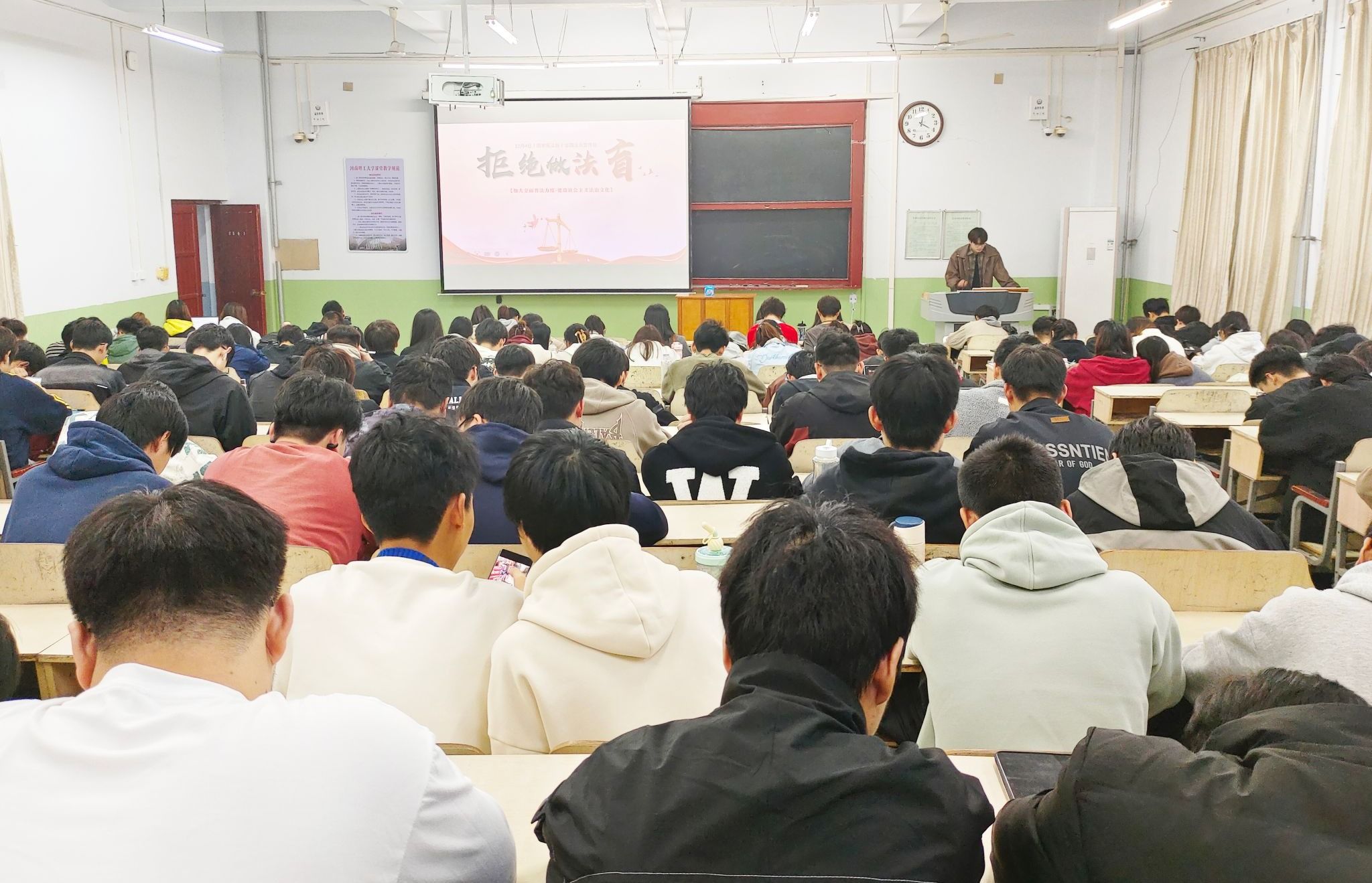 召开主题班会,实现法治动员全覆盖。学院选择以“拒绝做法盲”为主题召开班会,宣讲习近平法治思想,重视法治教育与安全教育相结合,切实增强了广大学生的法治意识、安全意识和防范能力。