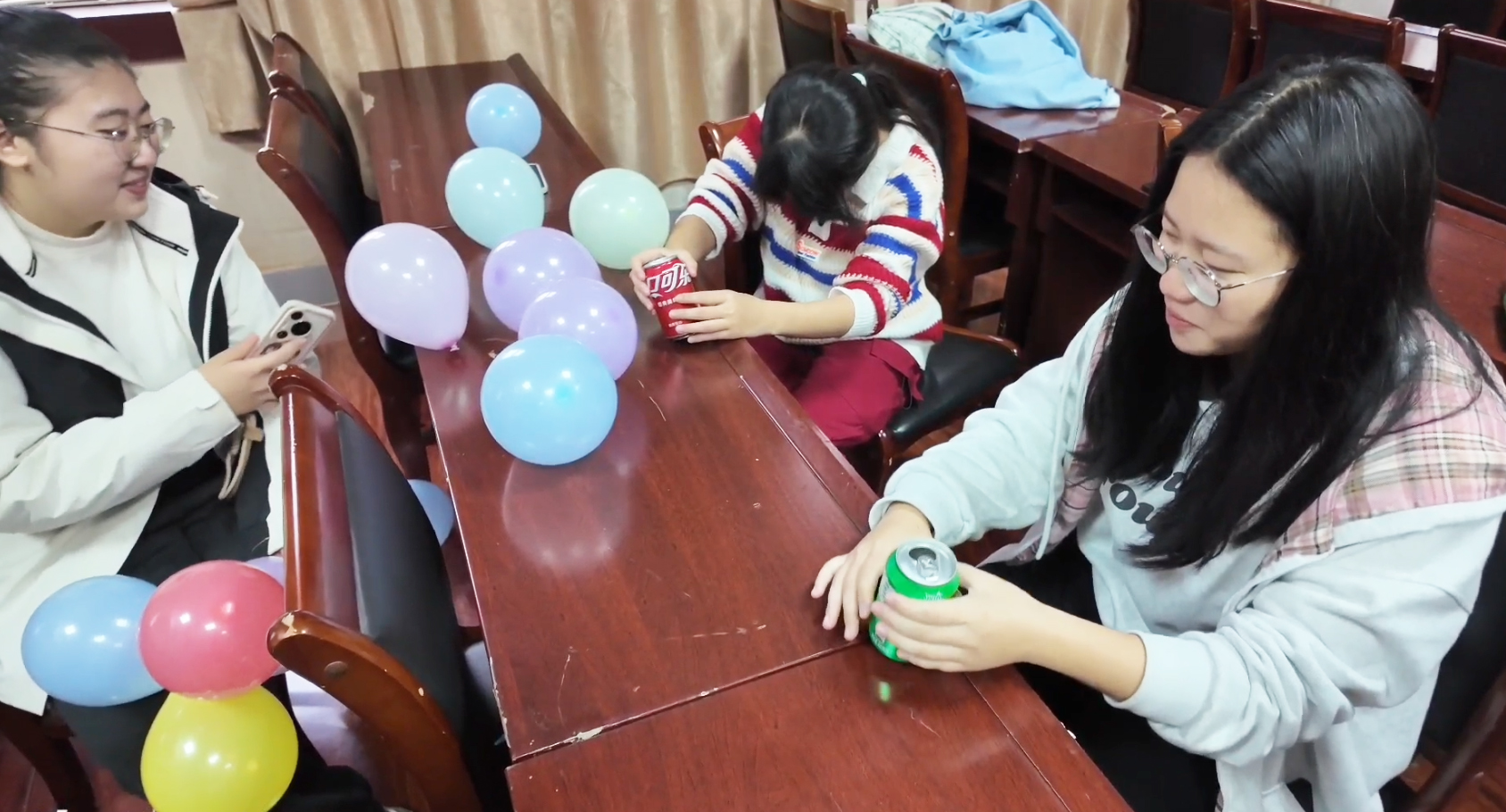 此次活动通过“背靠背运球”、“数字炸弹”、“侧立饮料瓶”一系列富有挑战性和互动性的团体游戏,帮助同学们在轻松的氛围中放松身心,调节情绪,并提升了应对压力的心理韧性。“背靠背运球”活动不仅需要参赛者在物理上紧密配合,还要在心理上建立信任完成任务。在“数字炸弹”环节,游戏通过快速反应和精准配合挑战学生的集中力和心理素质,活动中的紧张气氛也让同学们学会了如何管理焦虑和压力。在“侧立饮料瓶”环节,学生们需将一个饮料瓶侧立在桌上,利用有限的道具与团队成员合作,将瓶子保持侧立并完成任务。这些心理游戏考验了同学们的细致观察、协调配合及创造性思维,同时在活动中也帮助大家锻炼了冷静思考和团队协作能力。