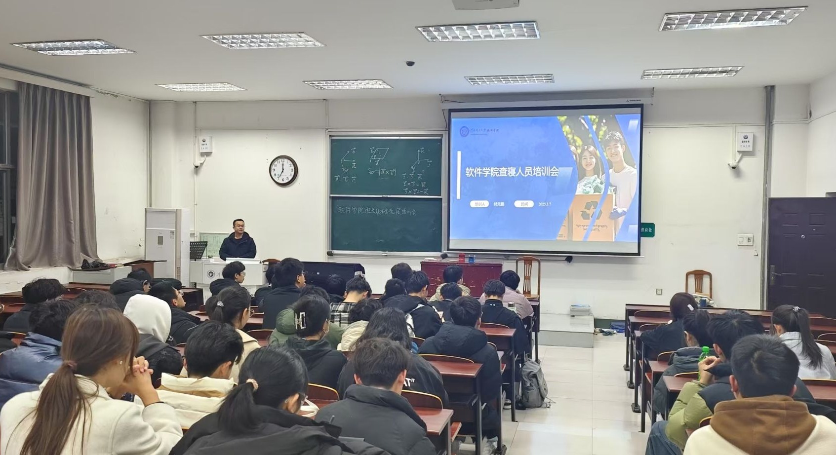 为进一步落实学校、学院关于宿舍检查工作的要求,创造一个安全、卫生、和谐的宿舍环境,同时提高宿舍检查的规范化水平以及检查人员的专业素质和服务能力,软件学院于3月7日晚在2106教室召开2024-2025学年宿舍检查工作培训会。本次会议由学院24级辅导员付元鹏主讲,院班联宿风部同学和23、24级全体生活委员参加。