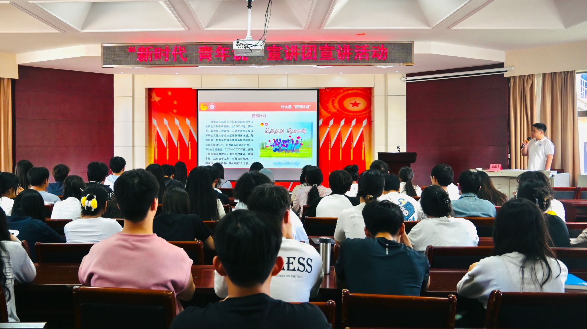 活动在庄严的国歌声中拉开帷幕。在专题宣讲环节,研究生支教团代表王振宇以《西部计划和研究生支教团专项计划相关政策解读》为主题,系统解读了西部计划及研究生支教团专项政策,并呼吁更多青年学子投身西部建设,践行新时代青年的使命与担当。"新时代,青年说"宣讲团成员刘霁月聚焦《奏响中国话语强音,守护国家安全命脉》主题,从国家安全的角度出发,阐述了新时代青年在维护国家安全中的重要作用。通过分析典型案例,阐释新时代青年维护国家安全的多元路径,强调构建中国话语体系对维护意识形态安全的重要意义。活动最后,全体同学齐唱团歌,在激昂的团歌声中坚定奋斗决心。