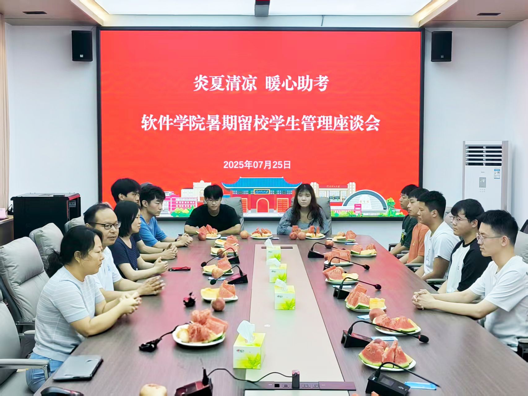为进一步加强暑期留校学生的教育管理,助力考研学生增强信心。7月25日上午,软件学院成功举办了2025年暑假留校学生慰问暨安全教育座谈会,为学生送去清凉关怀与成长指引。学院学工办主任刘军、团委书记王小趁以及22级辅导员,留校学生代表参与了此次活动,会议由刘军主持。