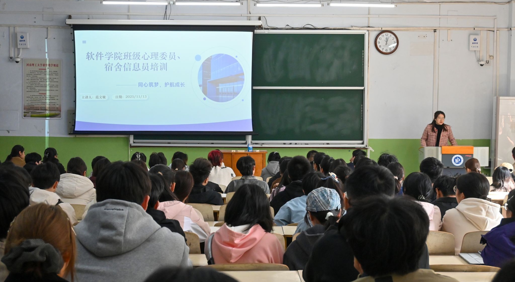 为进一步提升班级心理委员、宿舍信息员的专业能力,11月13日,软件学院在2教2101开展以“同心筑梦,护航成长”为主题的心理委员与宿舍信息员专项培训活动,本次培训由学院心理辅导员范文敏主讲。