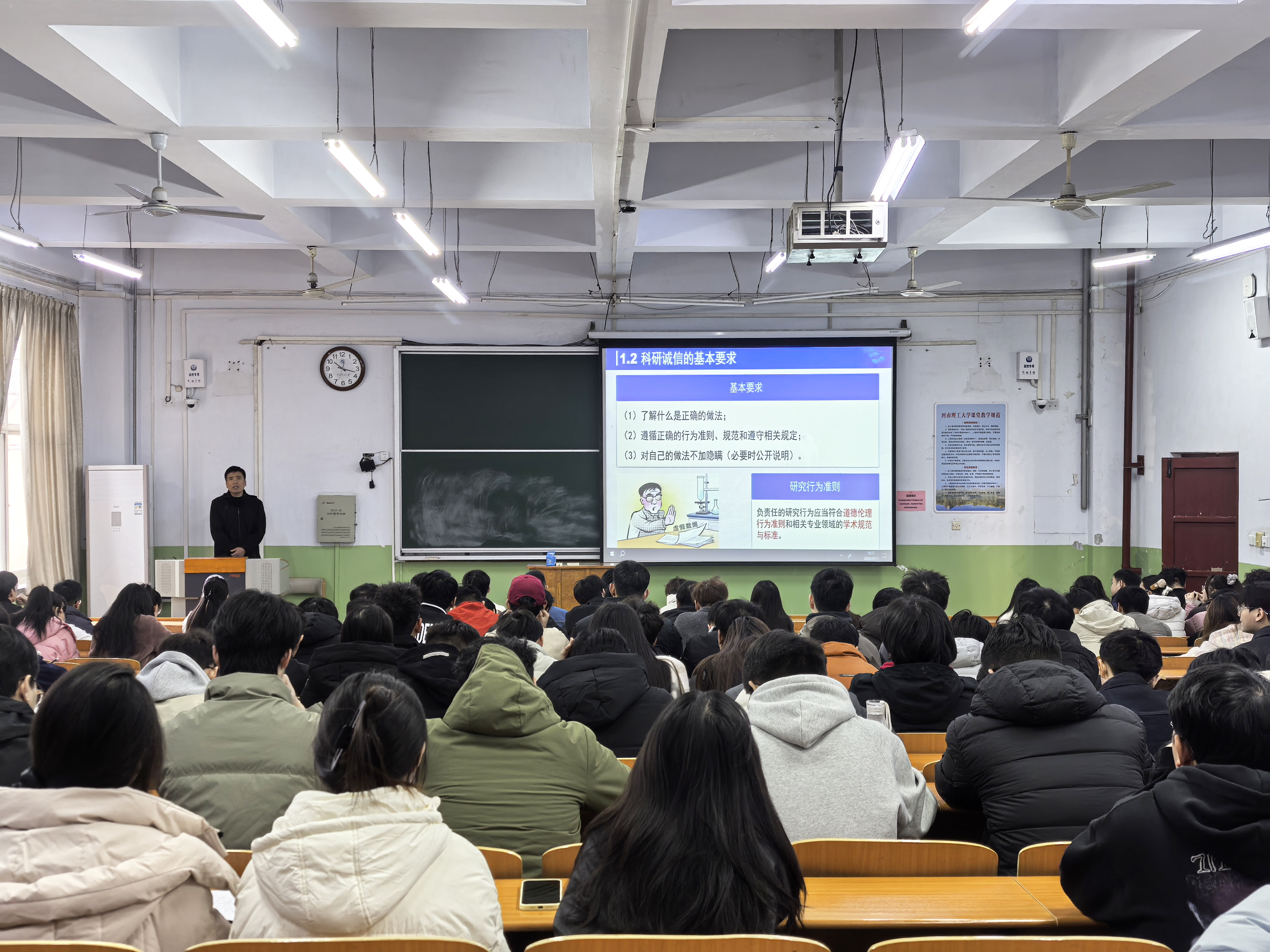 研究生导师罗军伟教授以“科研诚信与人工智能”为题为学院全体研究生开展专题讲座。罗教授从AI时代下科研诚信新形势、人工智能带来的诚信挑战,以及应对诚信挑战的相关策略展开阐述,他通过国内外AI使用不规范撤稿案例与传统学术不端问责事例,系统梳理学术不端行为表现,强调研究生需强化主体责任意识,严守学术规范,并指出“AI让科研更高效,也让诚信更重要”,为科研诚信建设指明方向。为发挥导师育人关键作用,学院同步组织研究生导师能力提升培训。培训聚焦科研诚信规范解读、学术指导技巧提升等核心内容,明确“以身作则树诚信榜样”的育人要求。面向全体2025级研究生开展“学术诚信第一课”,通过解读《中华人民共和国学位法》《教育部关于加强高等学校科研诚信建设和学术不端治理的指导意见》及《学术不端处理办法》等文件,明确学位授予标准、学术不端行为界定及惩戒机制。组织全体研究生签署《学术道德承诺书》,呼吁研究生以实际行动践行诚信承诺。