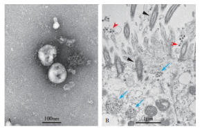 图2 A.新型冠状病毒颗粒,直径约为100 nm;B.人呼吸道上皮细胞超微切片中的新型冠状病毒颗粒,红色箭头示胞外病毒颗粒,蓝色箭头示病毒形成的包涵体,三角形示呼吸道上皮细胞纤毛。(高等学校新型冠状病毒肺炎防控指南)