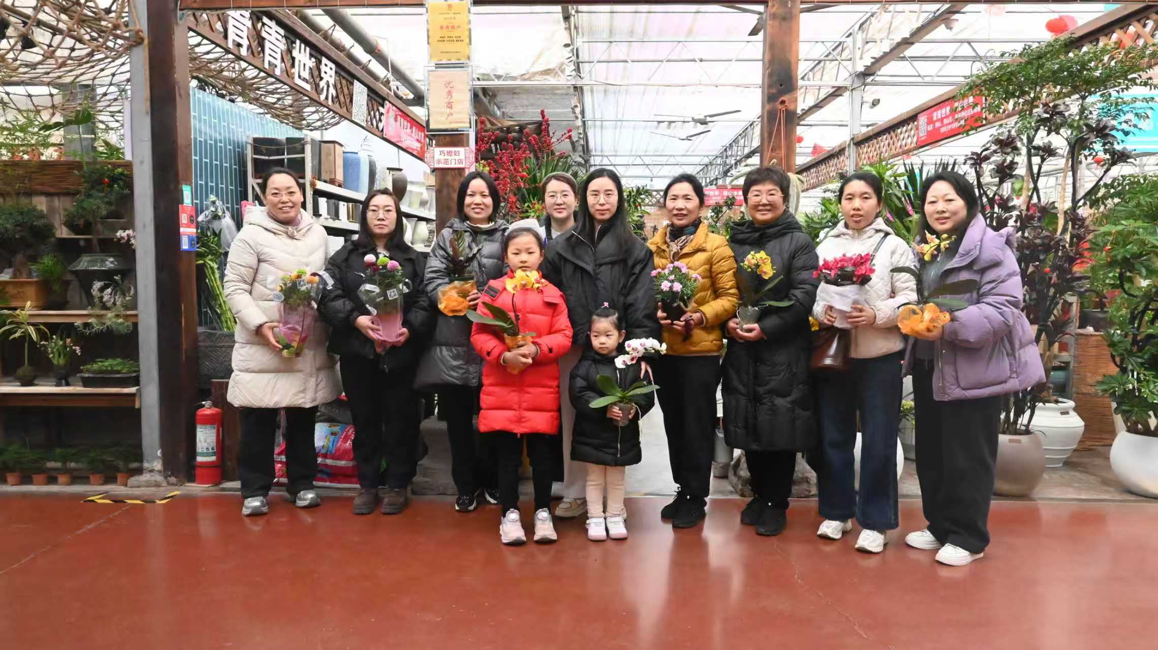 花卉市场繁花似锦、绿意盎然,各式各样的盆栽花卉鲜艳夺目、美不胜收。女教师们漫步于花海之间,兴致勃勃地观赏各类花卉绿植,相互交流选购心得,挑选心仪花卉。花香萦绕,笑意盈盈,大家共度了一段温馨美好的时光。活动最后,大家捧着满载心意的绿植,在花卉市场前合影留念,定格下春日的美好与节日的喜悦。